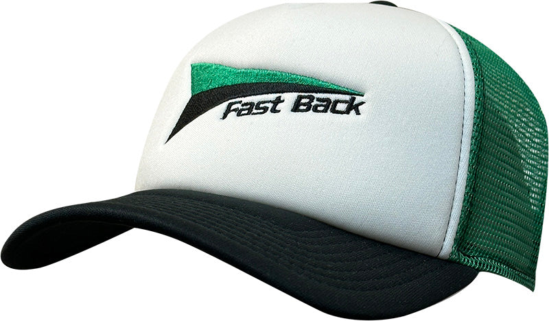Trucker style snap back cap. Embroidered White foam with Black mesh.
