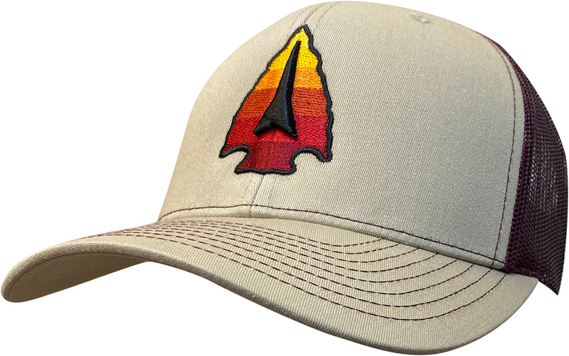 Adjustable Richardson 112. Khaki front with Burgundy mesh. Arrowhead with 3D Rocket on front . #03RGA