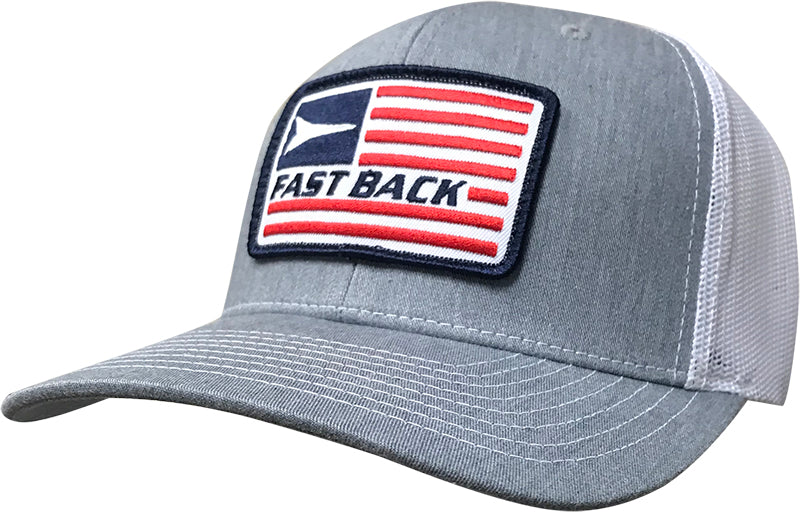 Richardson 112. Heather Grey with White Mesh adjustable snapback. Fast Back flag patch on front. #03REH
