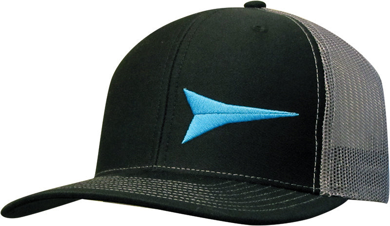 Adjustable Richardson 112. Black front with Charcoal mesh. Neon Turquoise rocket front left panel. #03RCT