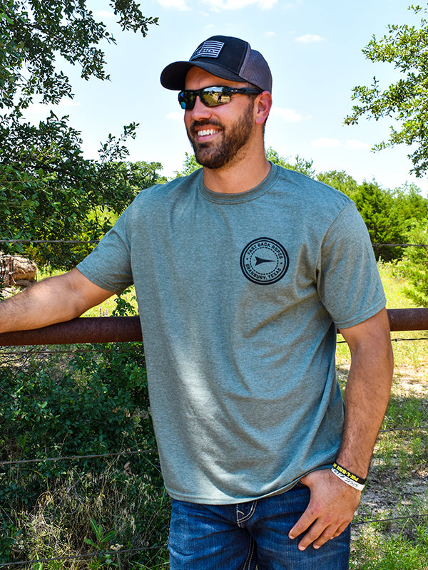 Super soft and comfy. Taped shoulder seams for comfort and durability. Classic crew neck styling. Slightly more trim fit in neck, shoulders and sleeves. 65% Polyester, 35% Ring Spun Cotton. Heather Forest Green. Design on left chest and back. Item No. 04OHGRN