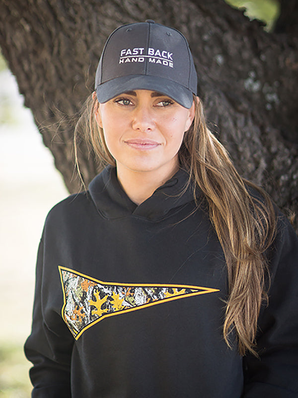 This comfy hoodie is 65% Cotton / 30% Polyester and built tough with solid construction and fine luxurious fleece. Brushed interior with clean finish twill tape neck seam. Classic kangaroo pouch hand warmer pocket. Two layer hood with flat draw cord. Black hoodie with Fast Back rocket Real Leaf camo design outlined in neon Orange. Sizes: 2X, Item No. 05CR